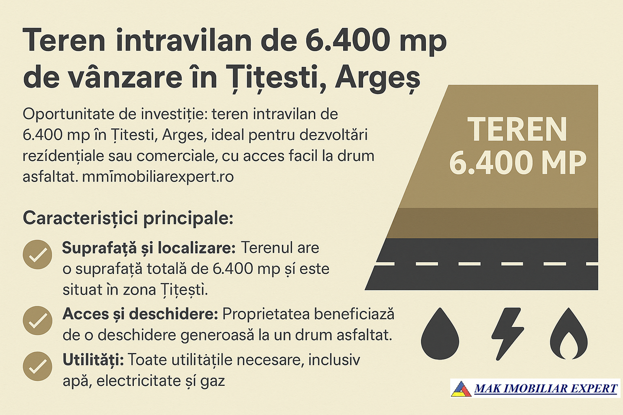 Meta descriere: Oportunitate de investiție: teren intravilan de 6.400 mp în Țițești, Argeș, ideal pentru dezvoltări rezidențiale sau comerciale, cu acces facil la drum asfaltat. mmimobiliarexpert.ro