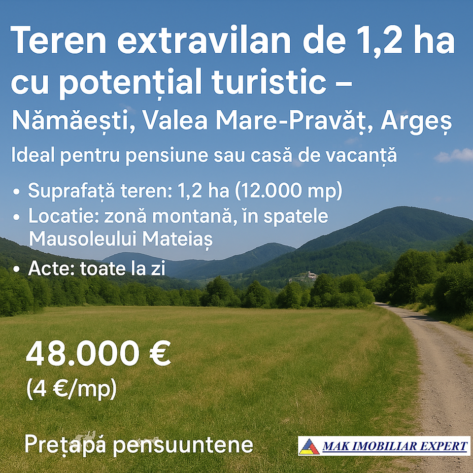 „Teren extravilan de 1,2 ha în Nămăești, Valea Mare-Pravăț, Argeș, ideal pentru pensiune sau casă de vacanță, situat într-o zonă montană. Preț: 48.000 €.”