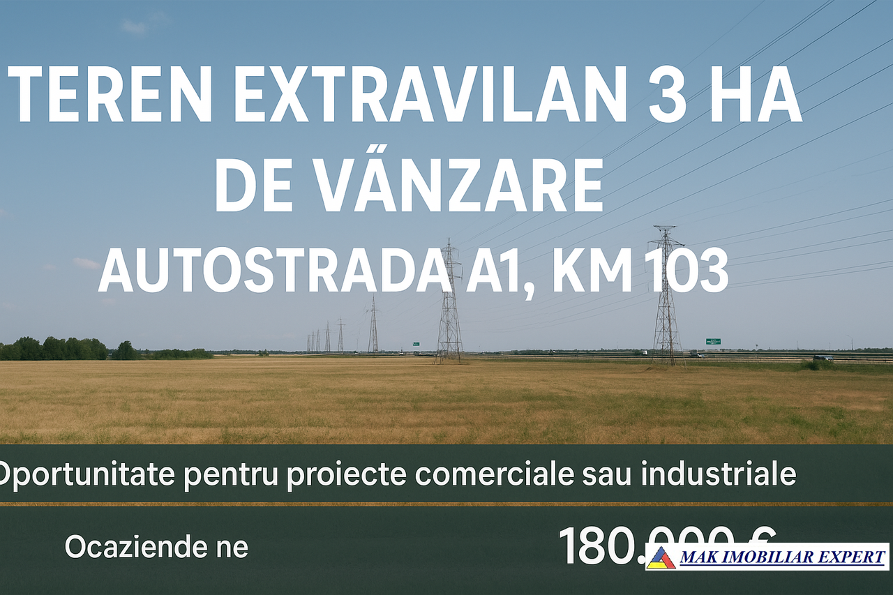 Îți oferim un teren extravilan de 3 hectare lângă Autostrada A1, Km 103, ideal pentru proiecte comerciale sau industriale. Contactează-ne pentru detalii și descoperă potențialul acestui teren!