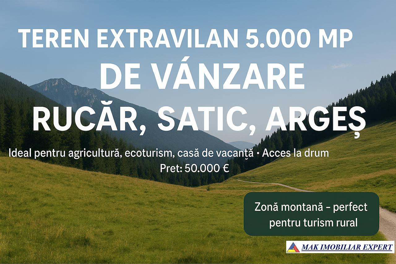 Meta Descriere: Teren extravilan de 5.000 mp în Rucăr, Sătic, Argeș, ideal pentru agricultură sau proiecte de turism rural, situat într-o zonă montană pitorească și liniștită.