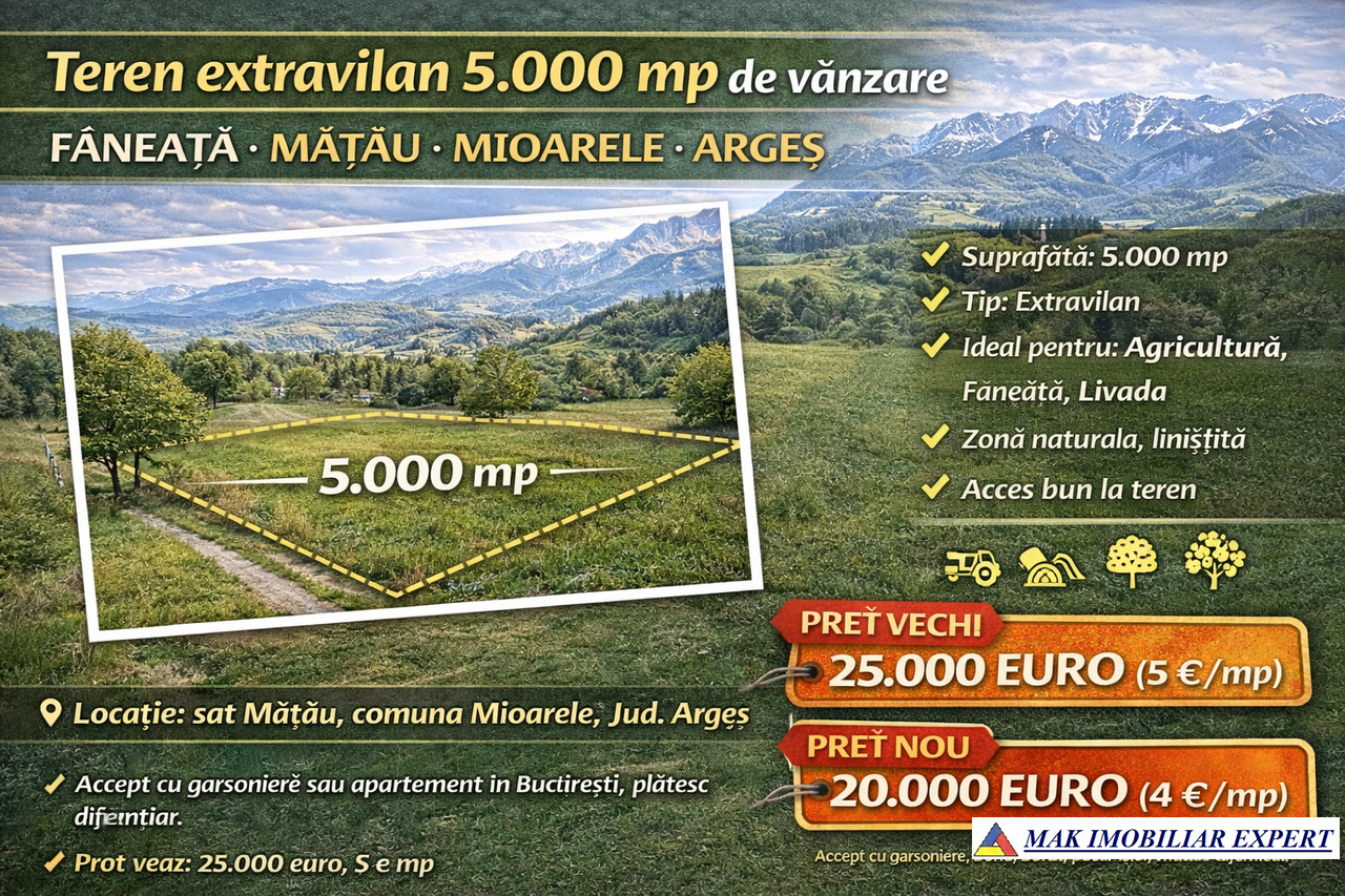 Meta Descriere: Teren extravilan de 5.000 mp în Mățău, Mioarele, Argeș, potrivit pentru fâneață sau livadă, cu acces facil și amplasat într-o zonă naturală.
