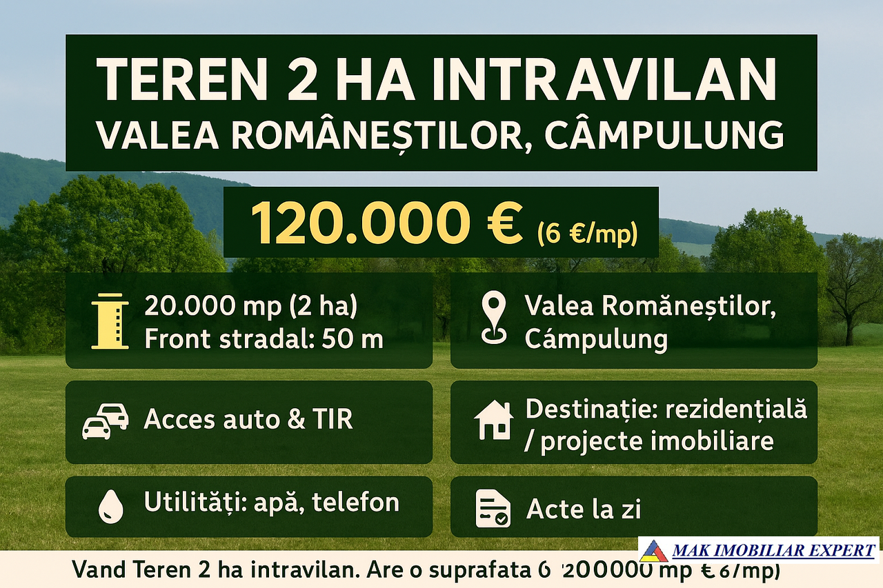 Acest teren intravilan de 2 hectare (20,000 mp), situat în Valea Româneștilor, Câmpulung Muscel, Argeș, oferă o oportunitate excepțională pentru dezvoltare rezidențială sau investiție pe termen lung. Amplasat într-o zonă liniștită și naturală, terenul este ideal pentru construcții rezidențiale de amploare, case de vacanță sau alte proiecte imobiliare. Caracteristicile principale ale acestui teren includ: