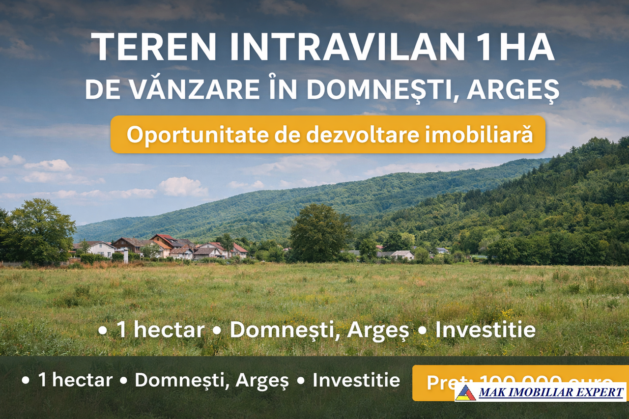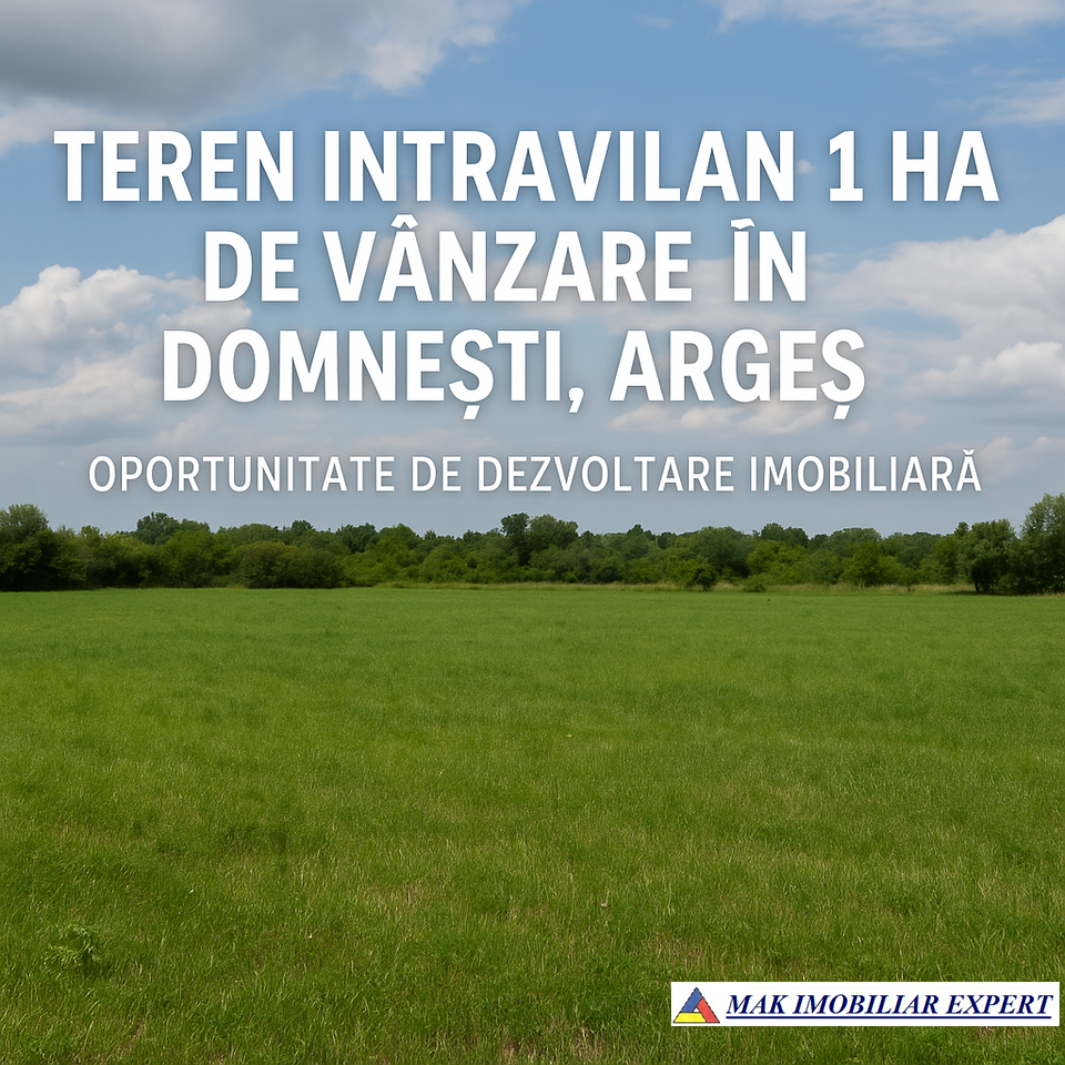 Meta Descriere: Teren intravilan de 1 ha situat în Domnești, Argeș, ideal pentru dezvoltări rezidențiale sau imobiliare într-o zonă liniștită și naturală. Oportunitate excelentă pentru investiții. Detalii complete pe site.