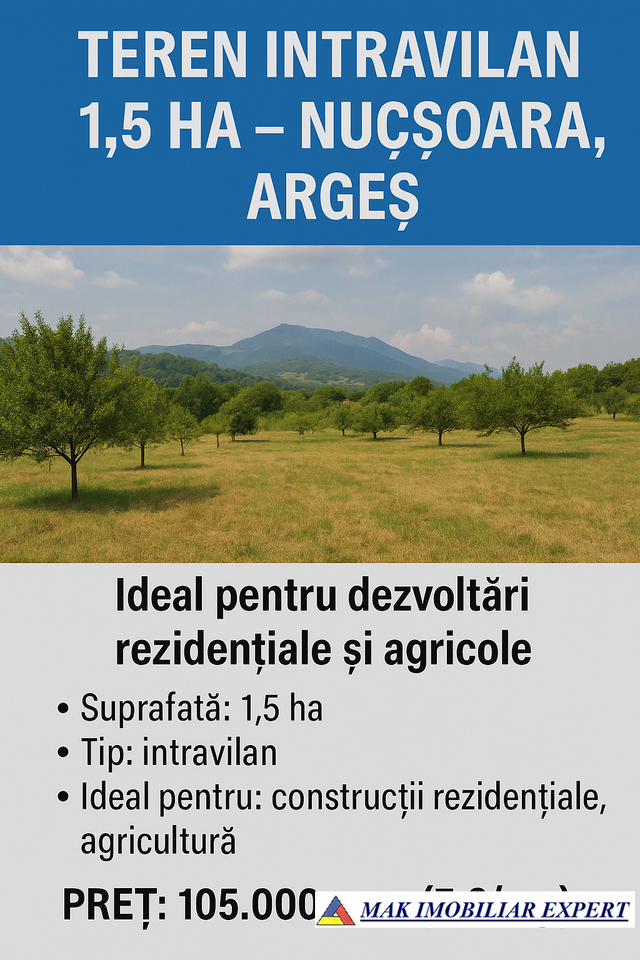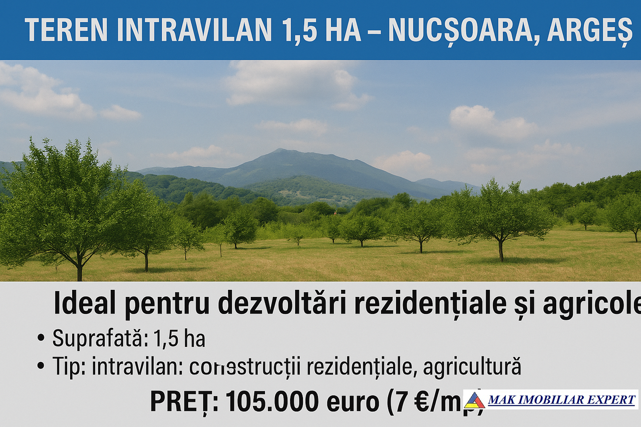 Meta Descriere: Teren intravilan de 1.5 ha în Nucșoara, Argeș, potrivit pentru proiecte rezidențiale sau agricole, amplasat într-o zonă liniștită și naturală.