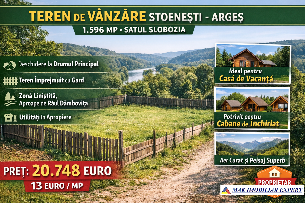 Teren de vanzare - 1.596 mp - satul Slobozia, comuna Stoenesti Proprietar vand teren intravilan cu suprafata de 1.596 mp, situat in satul Slobozia, comuna Stoenesti, intr-o zona linistita, inconjurata de natura, aproape de raul Dambovita. Deschidere la drumul principal Teren imprejmuit cu gard Peisaj superb, zona verde, ideala pentru casa de vacanta sau locuinta permanenta Utilitati in apropiere Locatia este perfecta pentru cei care cauta liniste, aer curat si acces facil la natura. Teren ideal pentru construireas unei case sau pentru niste cabane de inchiriat.