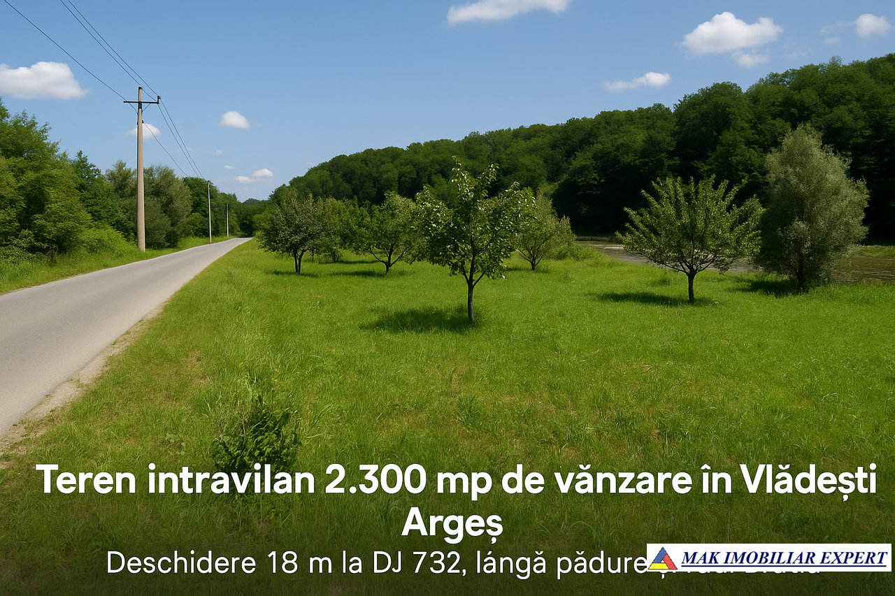 Vând teren intravilan 2.300 mp în Vlădești, Argeș, lângă pădure și râul Bratia. Deschidere 18 m la DJ 732. Preț: 10 €/mp.