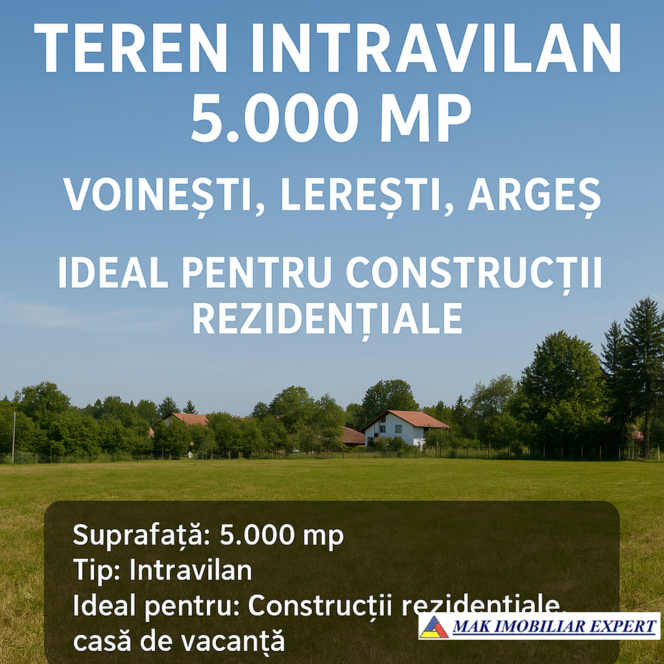 Meta Descriere: Teren intravilan de 5.000 mp în Voinesti, Lerești, Argeș, perfect pentru construcții de locuințe sau case de vacanță, cu utilități și acces facil.