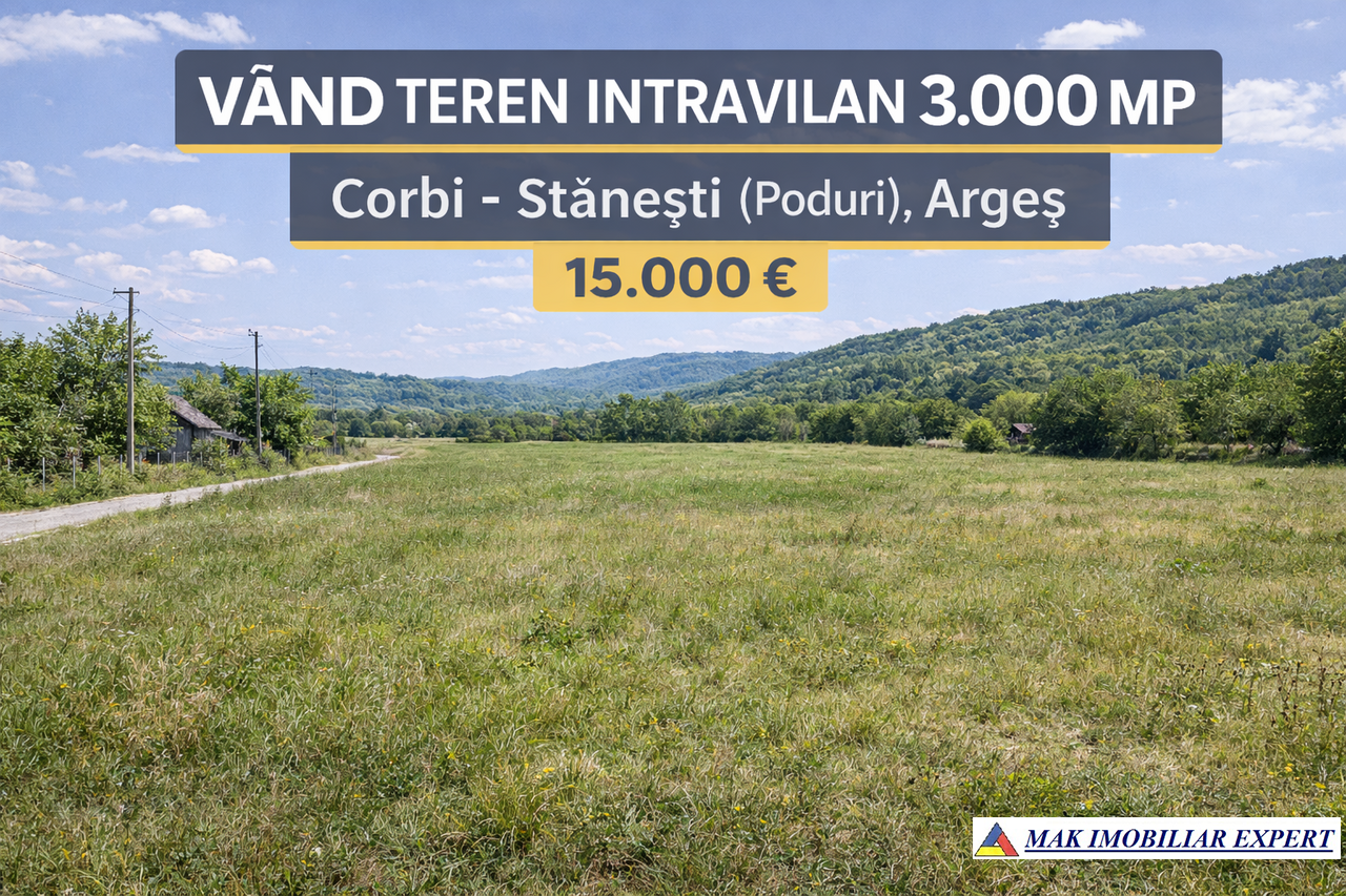 De vânzare teren intravilan cu suprafața de 3.000 mp, situat în județul Argeș, comuna Corbi, sat Stănești (Poduri), punctul Lunca, într-o zonă liniștită, cu cadru natural plăcut și acces facil.