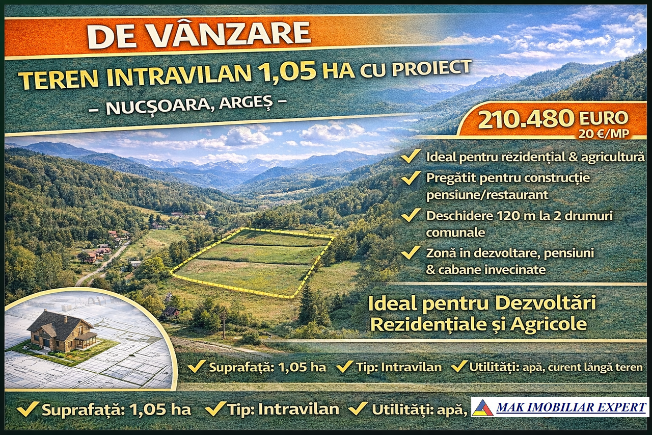 Meta Descriere: Teren intravilan de 1.05 ha în Nucșoara, Argeș, potrivit pentru construcții rezidențiale sau activități agricole, amplasat într-o zonă naturală liniștită.
