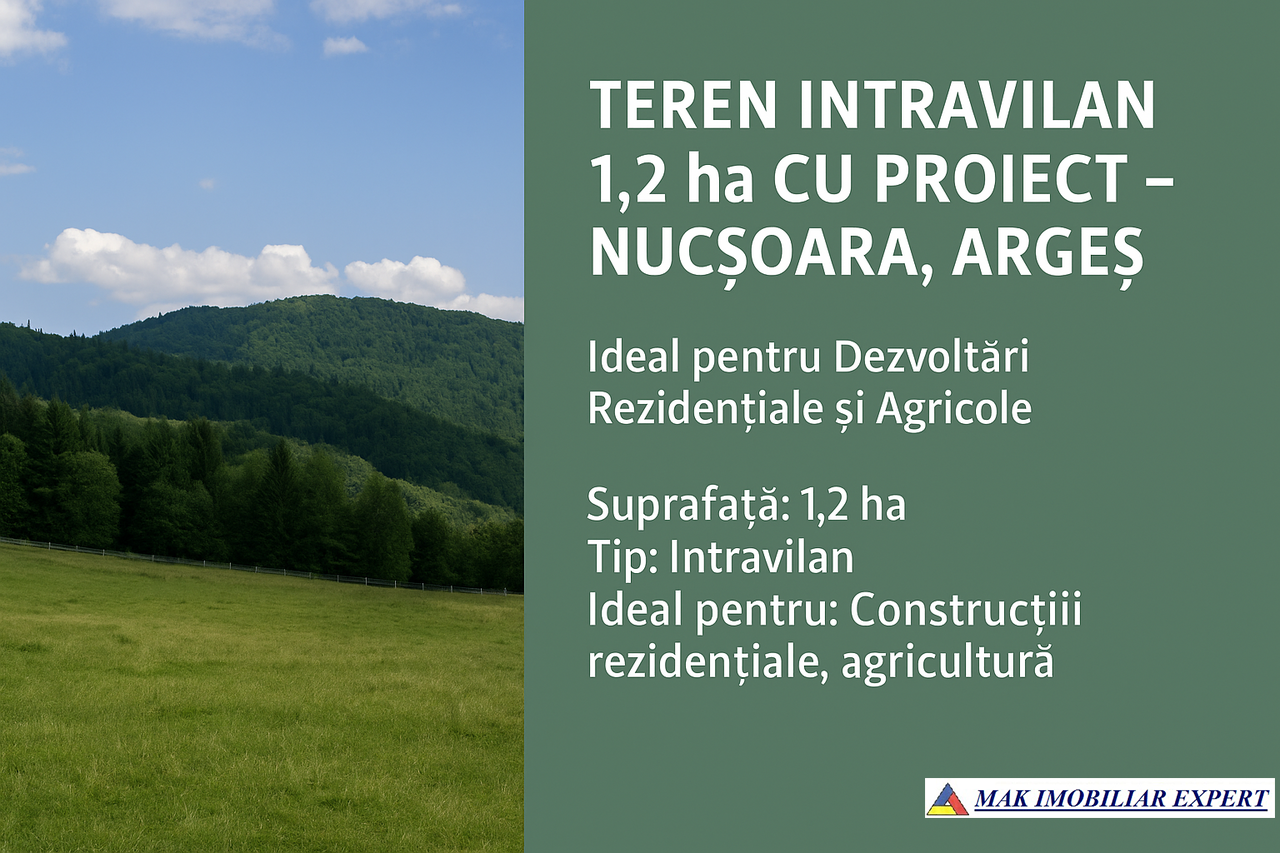 Meta Descriere: Teren intravilan de 1.2 ha în Nucșoara, Argeș, potrivit pentru construcții rezidențiale sau activități agricole, amplasat într-o zonă naturală liniștită.