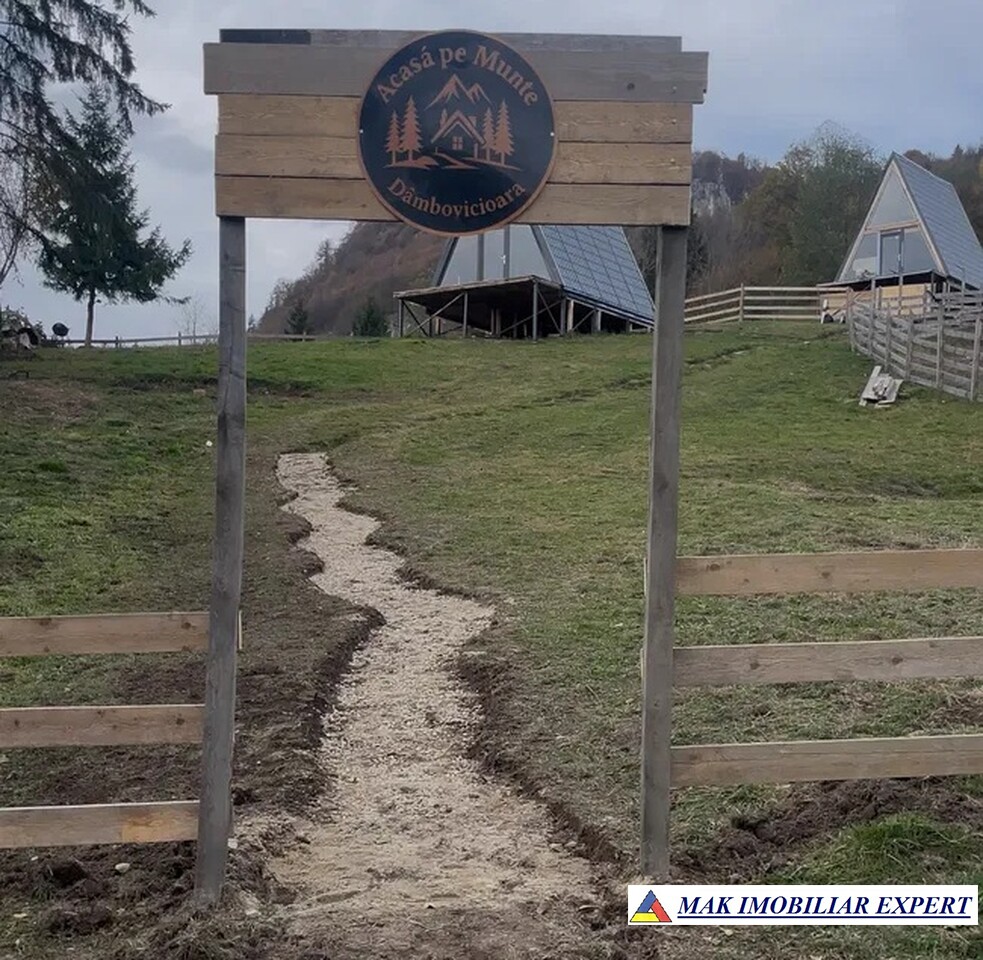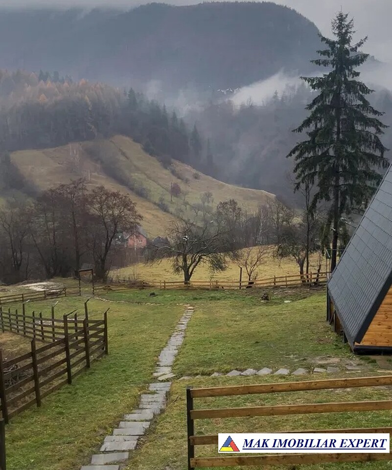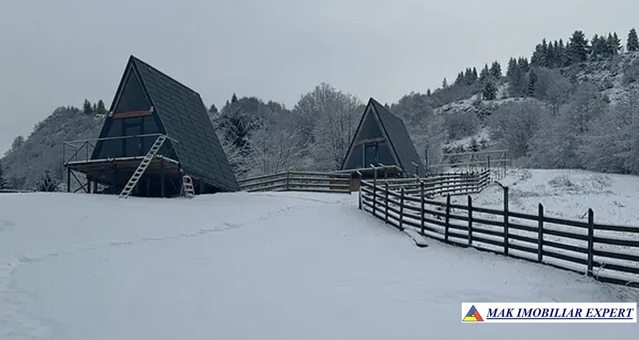 Cabana A-frame nouă, 2025, în Dâmbovicioara, lângă Parcul Național Piatra Craiului. Teren 400 mp, utilități complete. Preț 62.000 €.