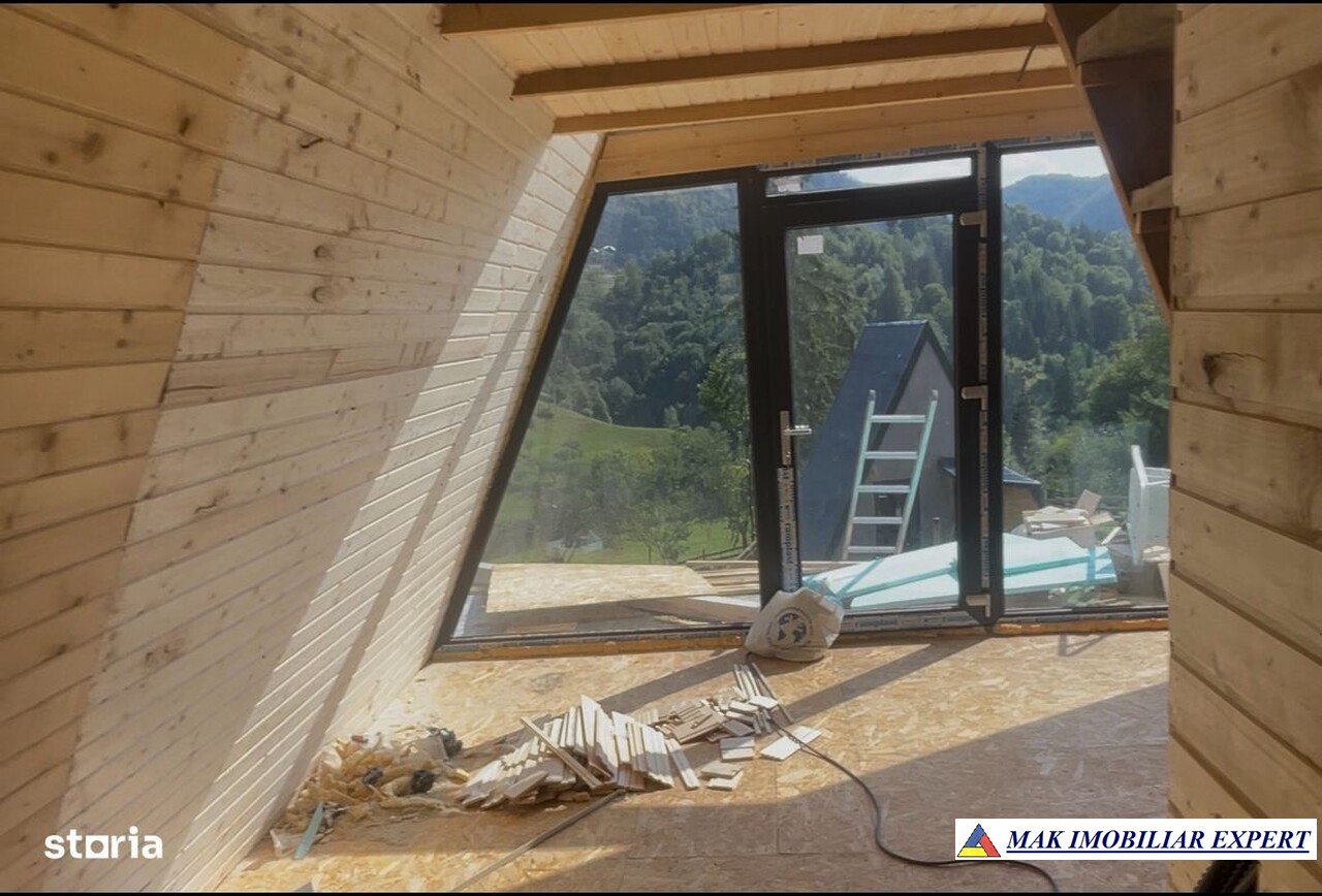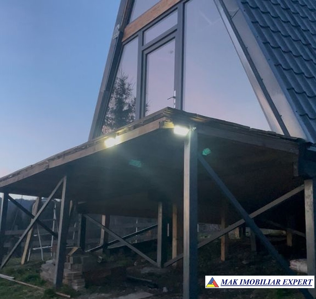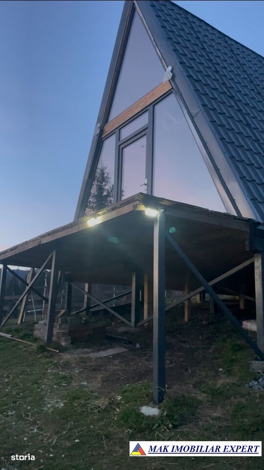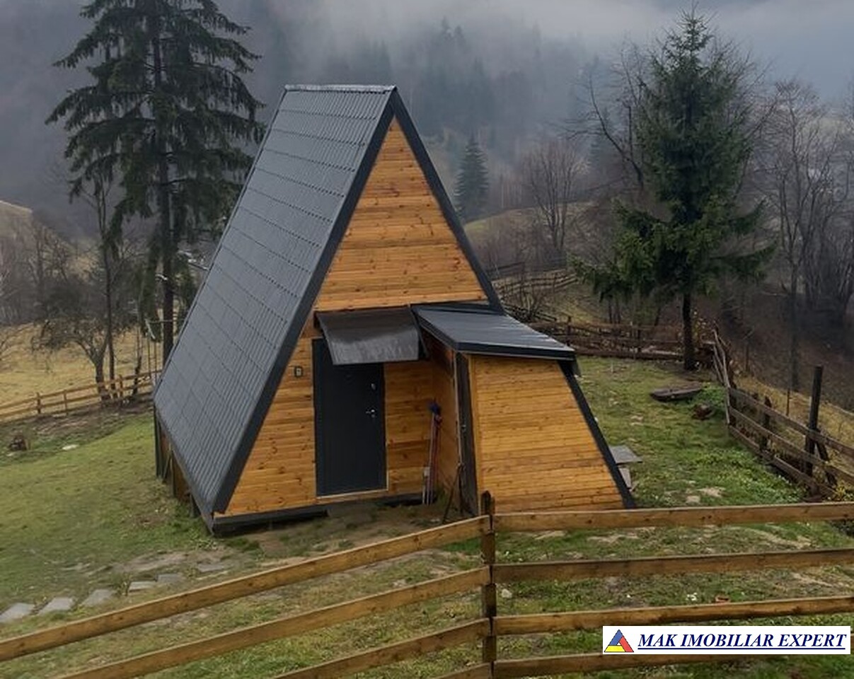 Cabana A-frame nouă, 2025, în Dâmbovicioara, lângă Parcul Național Piatra Craiului. Teren 400 mp, utilități complete. Preț 68.000 €.