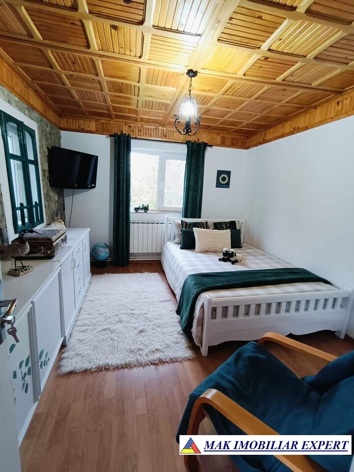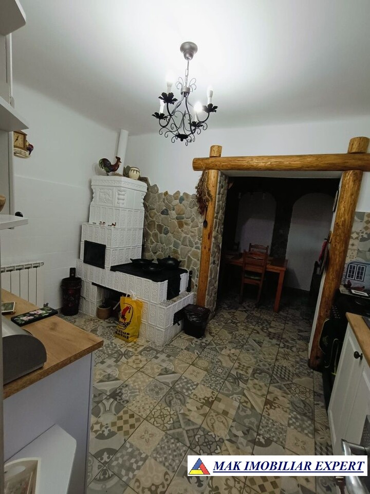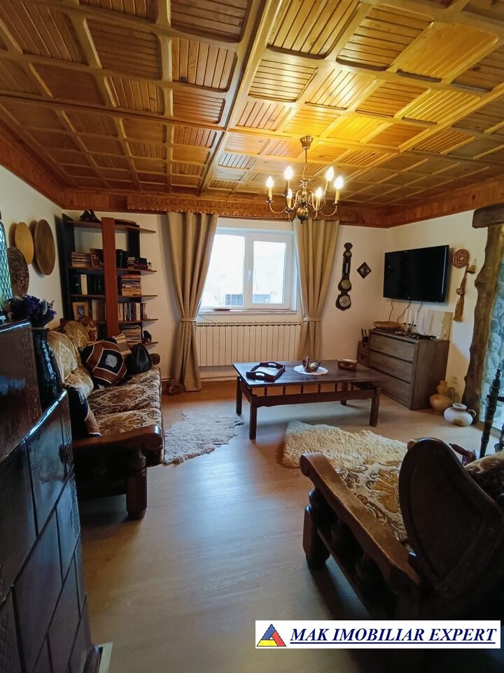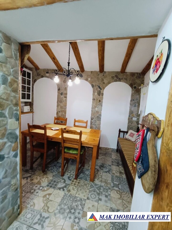 Locuința este amenajată în stil rustic, fiind compusă din: 2 dormitoare, salon, hol, bucătărie dublă, baie, cameră centrală, prispă, pivniță și magazie de lemne. Încălzirea este asigurată de centrală termică Viadrus, calorifere din aluminiu și sobe funcționale în toată casa, oferind confort pe tot parcursul anului.