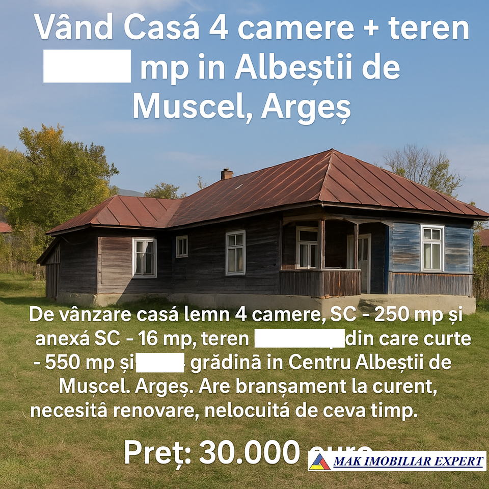 Casă din lemn 4 camere, 250 mp, cu teren 1.000 mp în Albeștii de Muscel, Argeș. Curent, anexe, necesită renovare. Preț 30.000 euro.