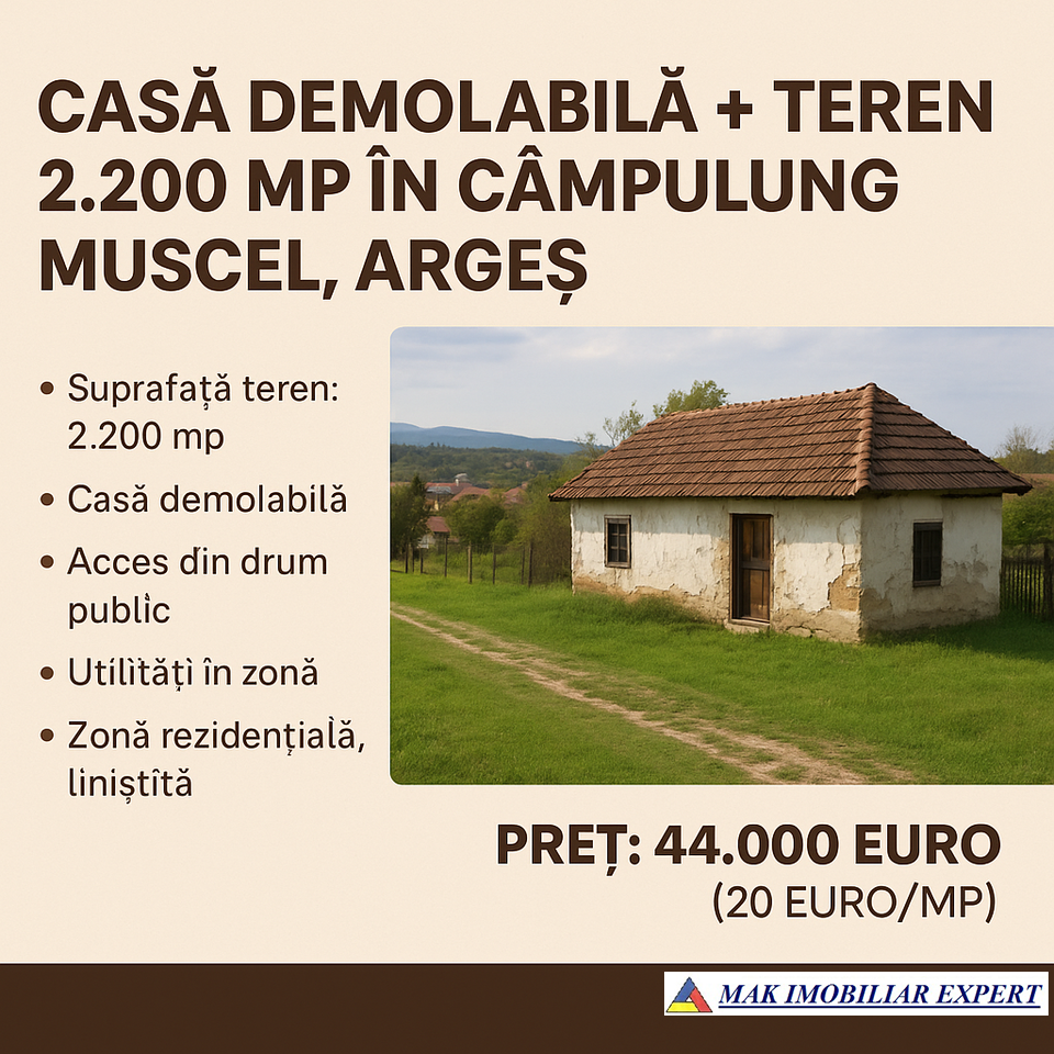 De vânzare casă demolabilă cu teren de 2.200 mp, situată în Câmpulung Muscel, județul Argeș — o locație excelentă pentru construirea unei locuințe noi sau pentru investiție imobiliară.