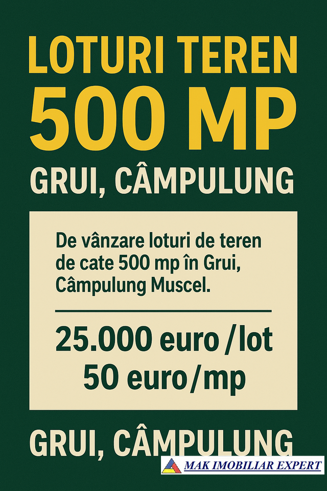 De vânzare 9 loturi de teren, fiecare având 500 mp, situate în cartierul Grui, municipiul Câmpulung Muscel, județul Argeș. Loturile sunt poziționate într-o zonă rezidențială în dezvoltare, cu acces rapid la facilitățile orașului, dar în același timp într-un cadru liniștit, ideal pentru construcția unei locuințe.