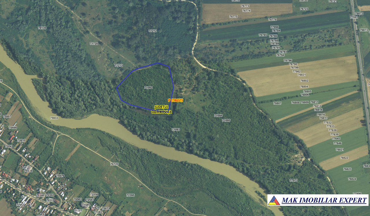 De vânzare teren forestier 28 ha pe malul Argeșului, lângă Găești. Acces auto, peisaj natural, ideal pentru agroturism sau exploatare. 140.000 €.