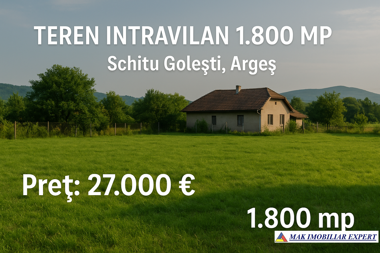 De vânzare teren intravilan în suprafață de 1.800 mp, situat în comuna Schitu Golești, județul Argeș. Proprietatea are o poziție bună, cu acces facil la drum și beneficiază de toate utilitățile necesare pentru construcții: