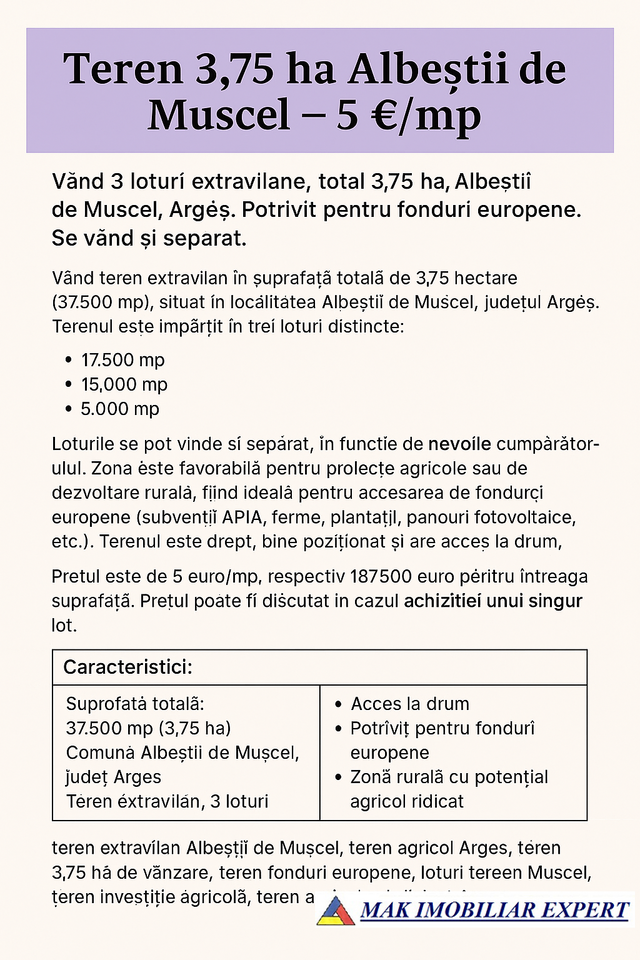 Vând teren extravilan în suprafață totală de 3,75 hectare (37.500 mp), situat în localitatea Albeștii de Muscel, județul Argeș. Terenul este împărțit în trei loturi distincte: