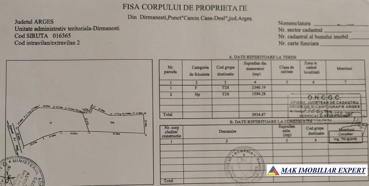 De vanzare 3,939,47 mp, deschidere de 23,68 m la 178 DJ731, are apa, curent canal la poarta, terenul se incheie in padure. Pe teren exista un măr imens, niste nuci ... pruni, in plus o padurice de 300 mp. ideal pentru constructie rezidentiala.