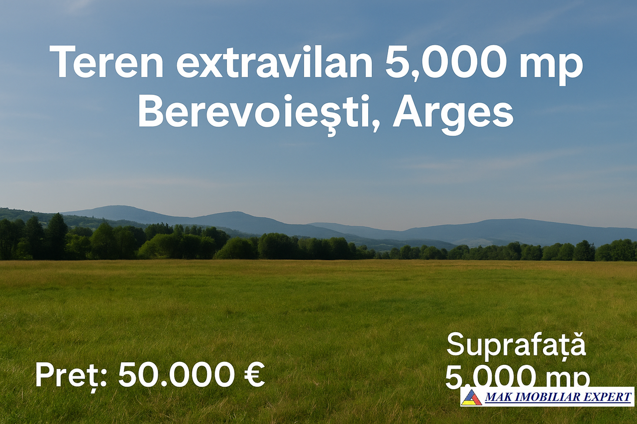 Teren extravilan 5.000 mp în Berevoiești, punctul Bătaia, aproape de șoseaua Curtea de Argeș–Câmpulung. Acte la zi. Preț 50.000 €.