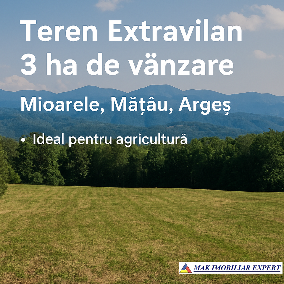 Meta Descriere: Teren extravilan de 3 ha în Mioarele, Mățău, Argeș, ideal pentru agricultură sau proiecte rurale, situat într-o zonă naturală accesibilă.