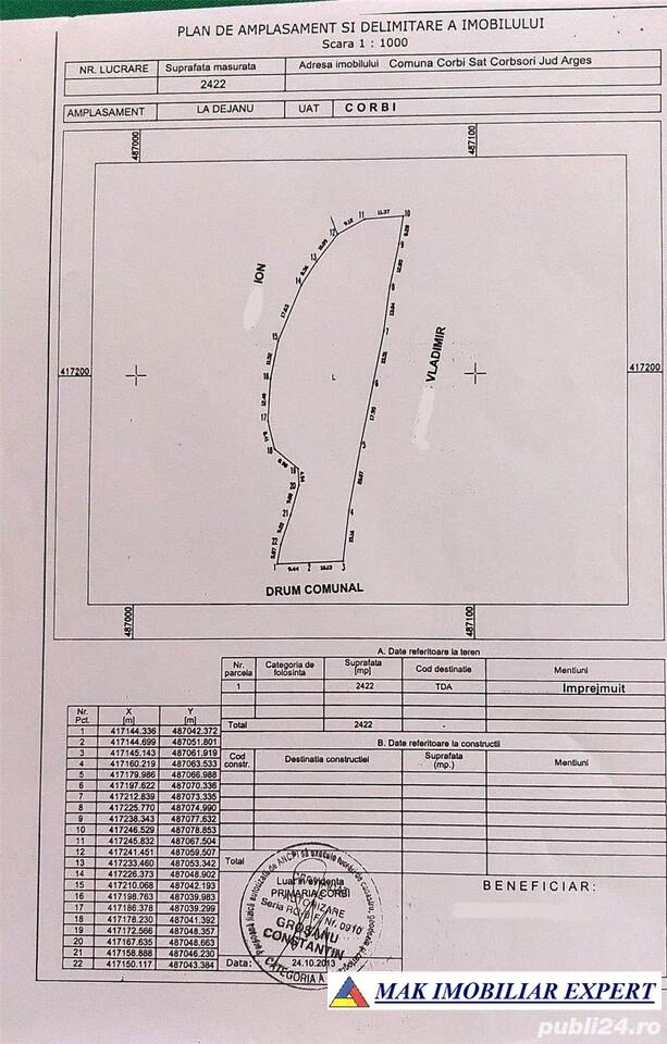 De vânzare teren intravilan cu suprafața de 2.412 mp, situat în comuna Corbi, județul Argeș, într-o zonă montană retrasă, cu intimitate totală, aer curat și priveliști spectaculoase asupra Văii Râului Doamnei și Munților Făgăraș. În zilele senine se poate observa Vârful Moldoveanu.