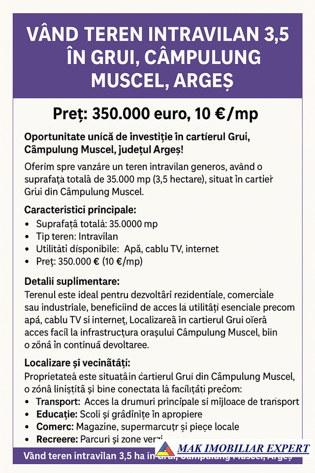 Teren intravilan de 35.000 mp în cartierul Grui, Câmpulung Muscel, ideal pentru dezvoltări rezidențiale sau comerciale. Preț: 350.000 €.