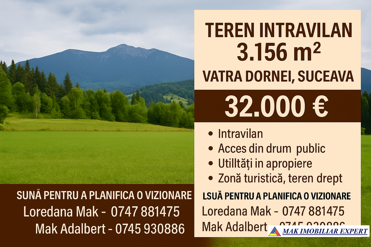 De vânzare teren intravilan 3.156 mp în Vatra Dornei, Suceava. Zonă excelentă pentru construcție sau investiție. Preț 32.000 euro.