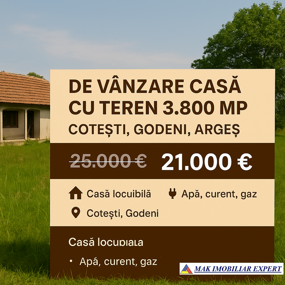De vânzare casă locuibilă cu toate utilitățile și teren 3.800 mp, Cotești, comuna Godeni, Argeș. Preț accesibil: 21.000 €.