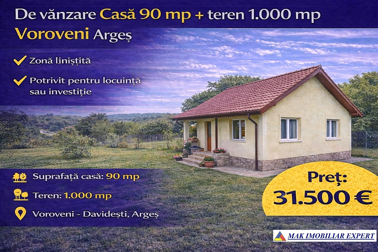 Casă 90 mp cu teren 1.000 mp în Voroveni – Davidești, Argeș. Zonă liniștită, ideală locuință sau investiție. 34.800 €.