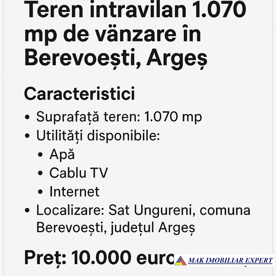 Teren intravilan 1.070 mp în sat Ungureni, comuna Berevoești, Argeș, ideal pentru construcție casă. Utilități: apă, cablu TV, internet. Preț: 10.000 euro.
