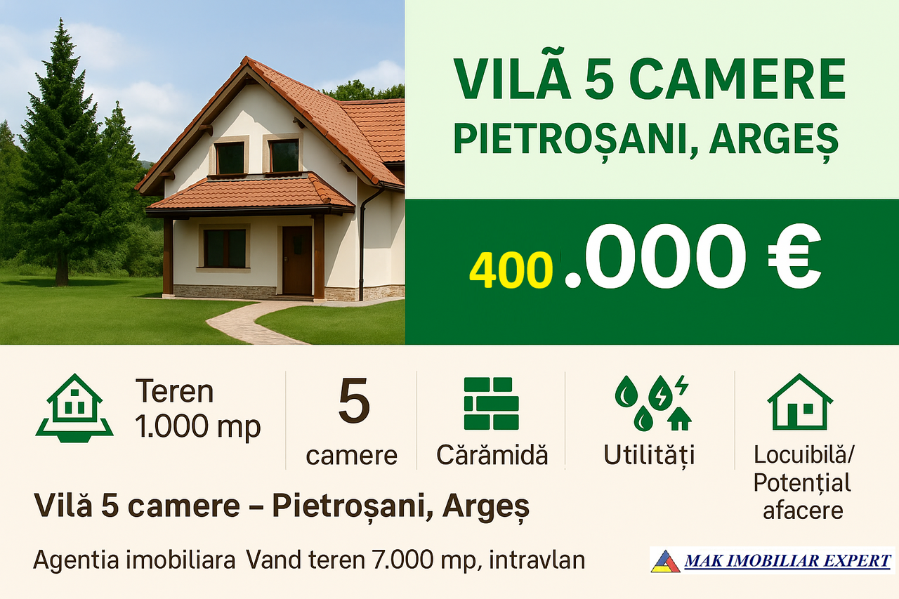 Vilă spațioasă cu 5 camere, 1.000 mp teren, situată în Pietroșani - Domnești, Argeș. Ideală pentru locuință sau business.