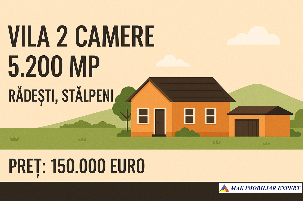 Vând vilă 2 camere în Rădești, Stâlpeni Argeș, teren 5.200 mp, construcție nouă, magazie, grajd, gaze, curent, puț și livadă. Preț: 150.000 euro.