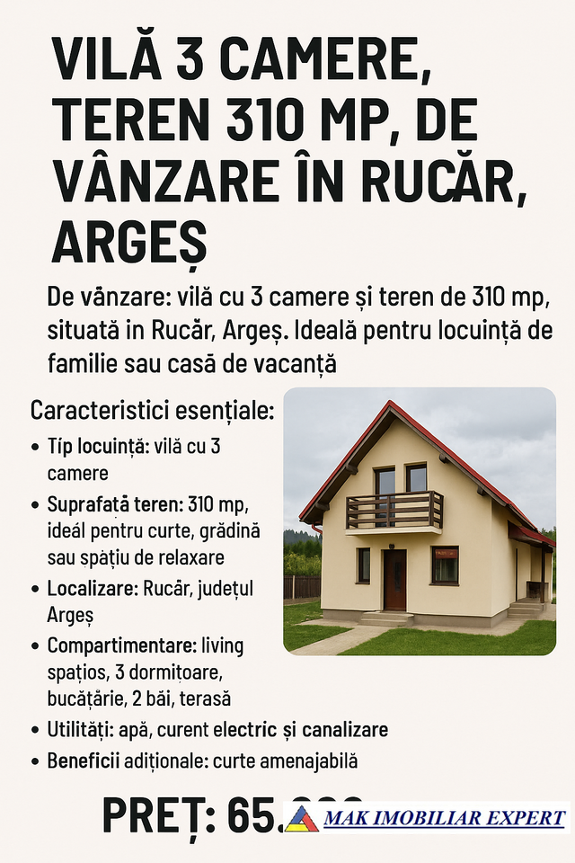 De vânzare: vilă cu 3 camere și teren de 310 mp, situată în Rucăr, Argeș. Ideală pentru locuință de familie sau casă de vacanță.