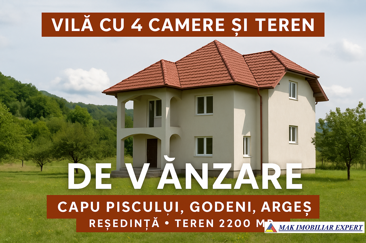 Meta Descriere: Vilă cu 4 camere și teren în Capul Piscului, Godeni, Argeș, ideală pentru reședință într-o zonă liniștită, oferind spațiu generos și confort.