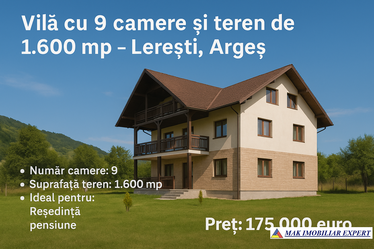 Meta Descriere: Vilă cu 9 camere și teren de 1.600 mp în Lerești, Argeș, ideală pentru reședință sau pensiune, amplasată într-o zonă liniștită, perfectă pentru relaxare.