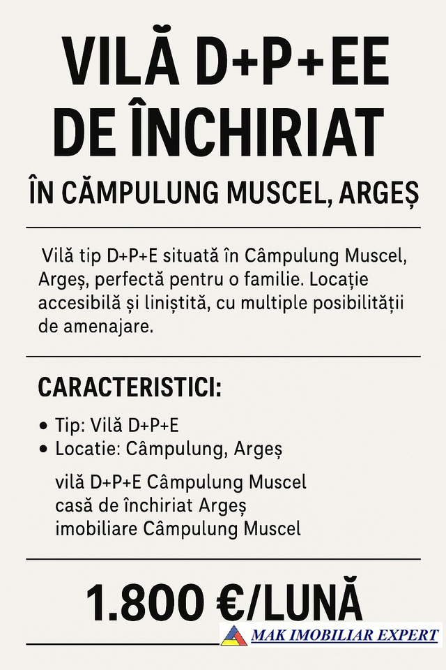 Agentie imobiliara - inchiriez Vila D + P + P Locatie: Campulung Muscel,Arges Suprafata utila 160 mp -demisol, 210 mp - parter, etaj Regim de inaltime: - Demisol: semicompartimentat - Parter: necomprtimentat - Etaj: necompartimentat Infrastructura: Electricitate electrica, incalzire prin gaz, apa canal Cladirea nu prezinta risc seismic Cladirea dispune de: 3 iesiri: 2 la parter, 1 la demisol 2 bai: parter Lucrarile de constructie au fost finalizate in anul 2023 In vecinatatea cladirii se afla: Scoala, Spalatorie, Clinica Dentara, Service auto Supermarket . Pretul inchirierii si detaliile cu privire la anunt se stabilesc in urma vizionarii.