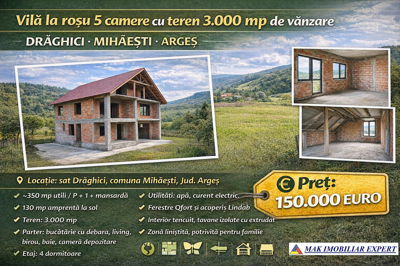 De vânzare vilă la roșu, situată în satul Drăghici, comuna Mihăești, județul Argeș, într-o zonă liniștită, cu acces facil și teren generos de 3.000 mp. Proprietatea este ideală pentru locuință de familie, reședință de vacanță sau investiție, oferind spații ample și multiple posibilități de amenajare.