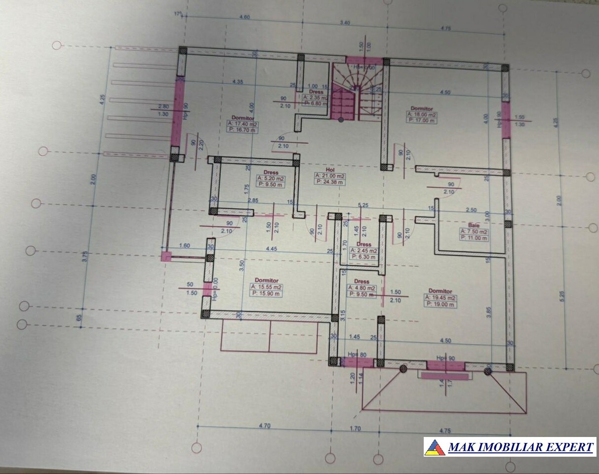 Etaj: 4 dormitoare, fiecare cu dressing propriu, 2 balcoane, baie