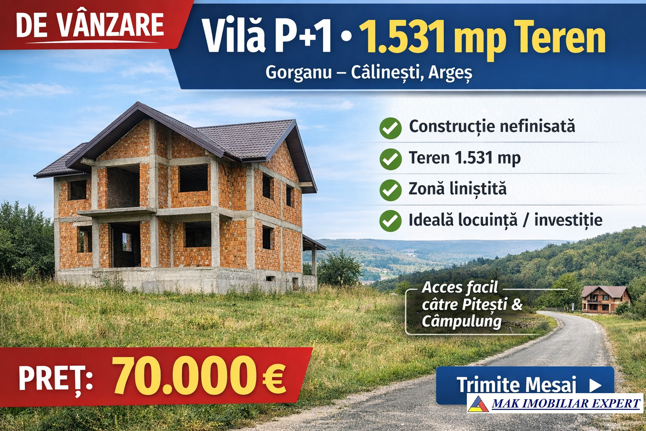 Se oferă spre vânzare vilă nefinisată cu regim de înălțime Parter + Etaj (P+1), situată în comuna Călinești, sat Gorganu, județul Argeș, într-o zonă liniștită, potrivită pentru locuință permanentă sau investiție.